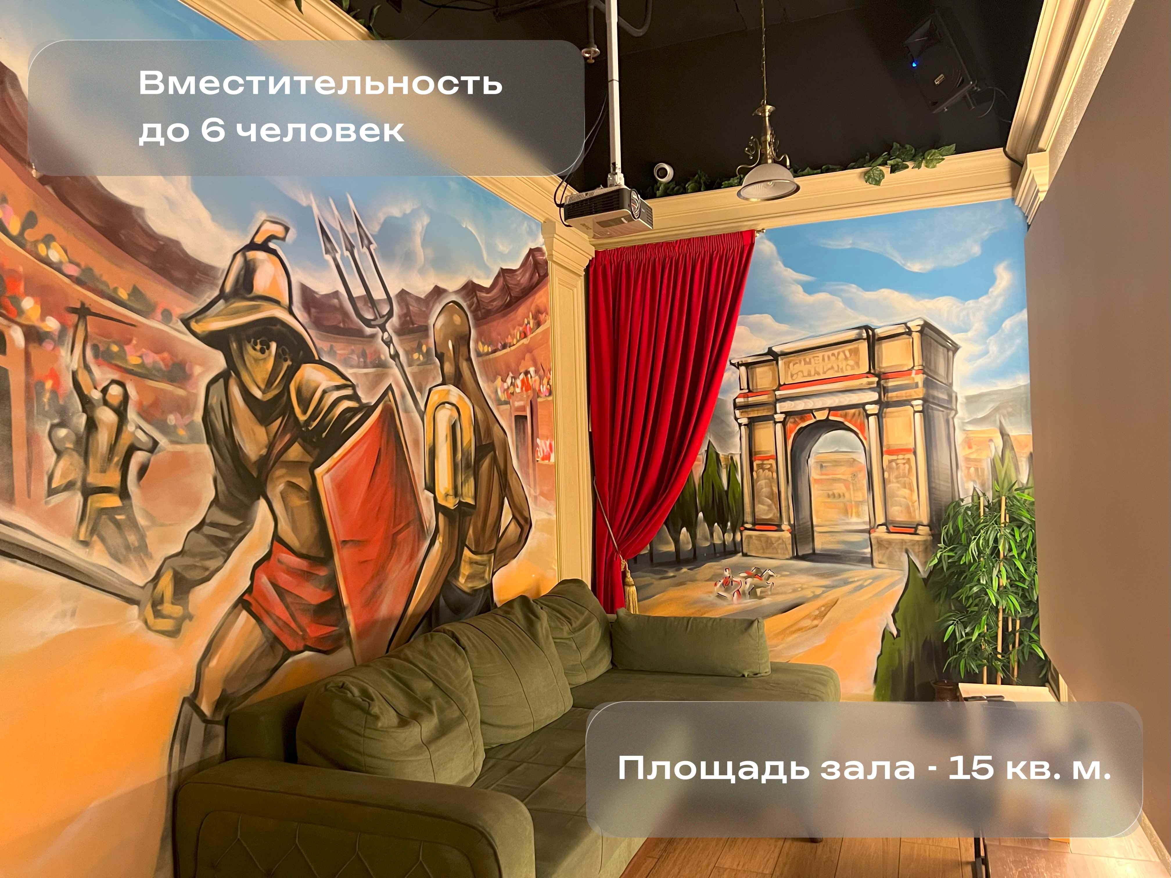 Лофт «Рим» — это величие античности, перенеcённое в современность. Настенные муралы с гладиаторами, величественная арка, каменные фактуры — всё здесь дышит эпохой Цезаря и Колизея. Хочется говорить торжественно, смеяться громко и ощущать себя частью великой истории. Идеально подойдёт для атмосферных встреч, нестандартных праздников и впечатляющих фото.