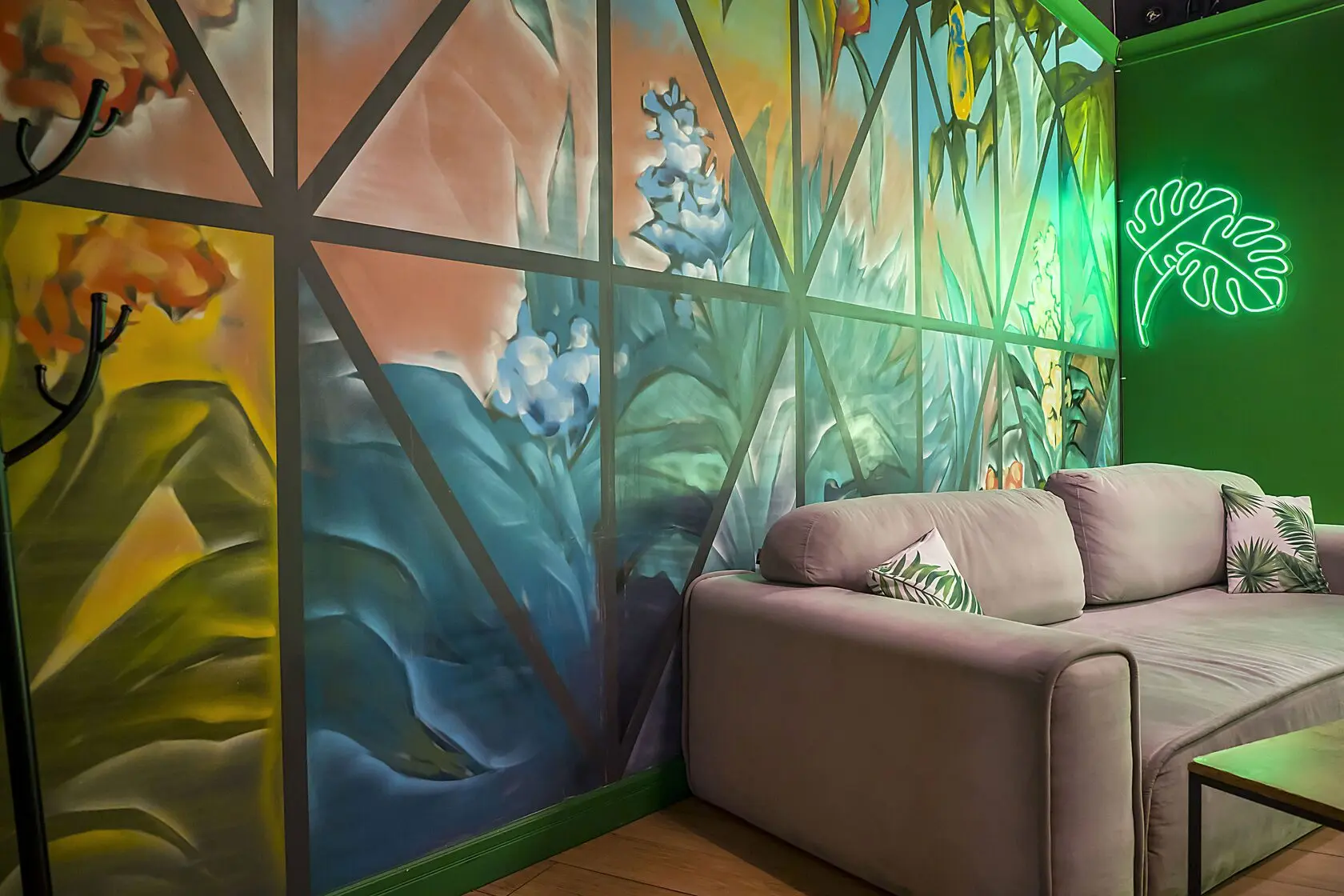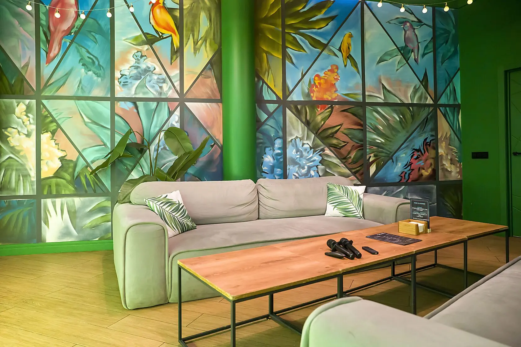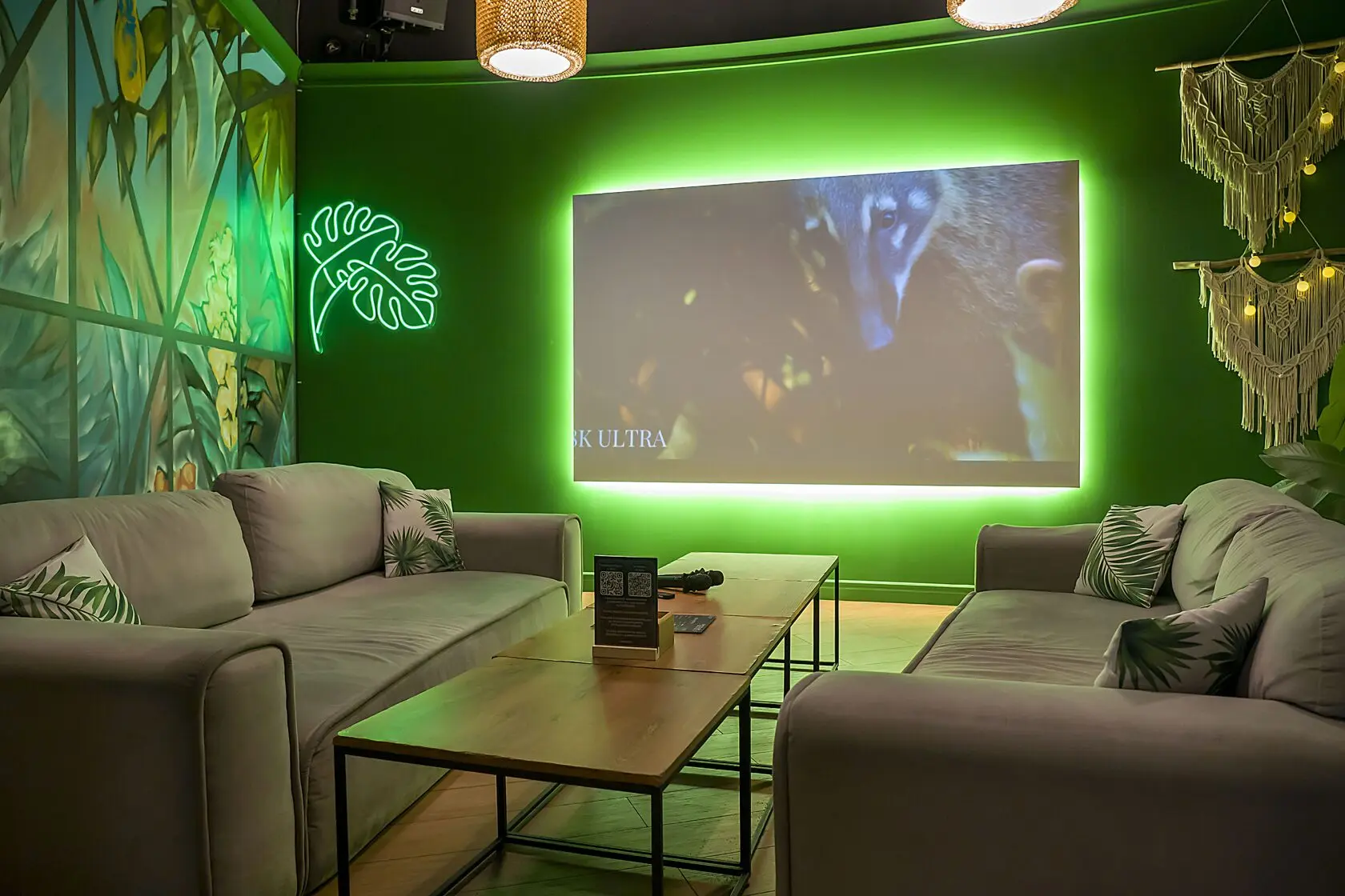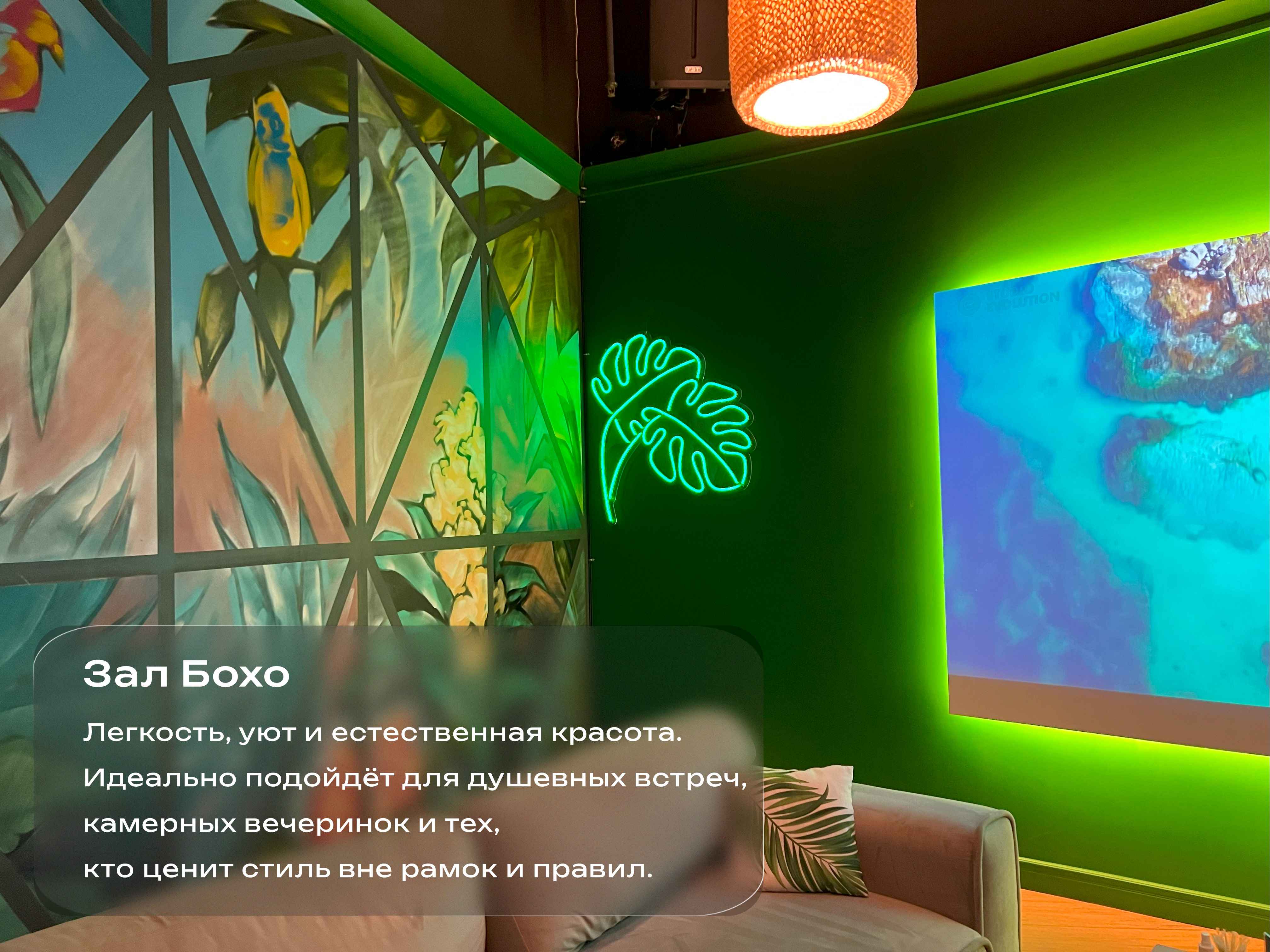 Лофт «Бохо» — это про лёгкость, уют и естественную красоту. Мягкие зелёные тона, комфортная посадка, тёплая, расслабляющая атмосфера — всё здесь располагает к искренним разговорам, спокойному отдыху и творческому настроению. Идеально подойдёт для душевных встреч, камерных вечеринок и тех, кто ценит стиль вне рамок и правил.