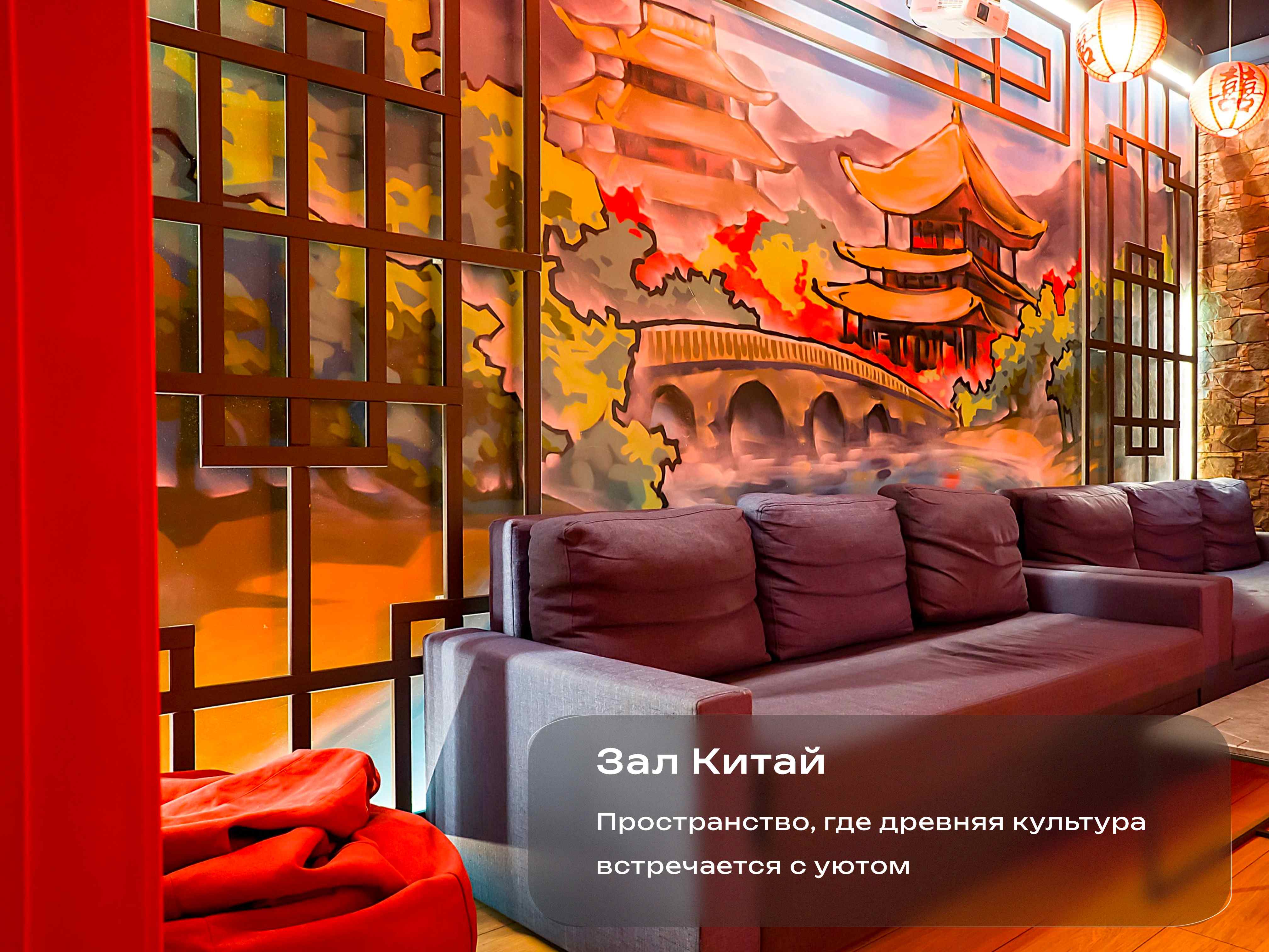 Лофт «Китай» — это пространство, где древняя культура встречается с уютом. Глубокие цвета, восточные акценты, декоративные элементы и мягкий свет создают атмосферу спокойствия и внутреннего равновесия. Здесь хочется говорить неторопливо, пить чай и наслаждаться атмосферой. Идеально подойдёт для душевных встреч, уютных вечеров и тех, кто ценит восточную эстетику.